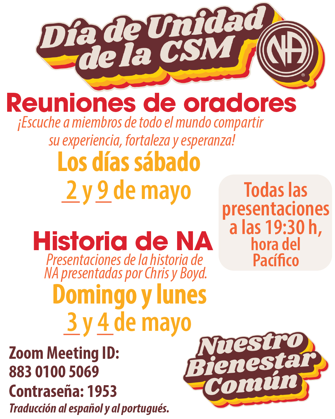 • 3 May & 4 May 2026, 7:30pm Pacific Daylight Time: NA HISTORY—NA history presentations by Chris and Boyd from the World Service Conference