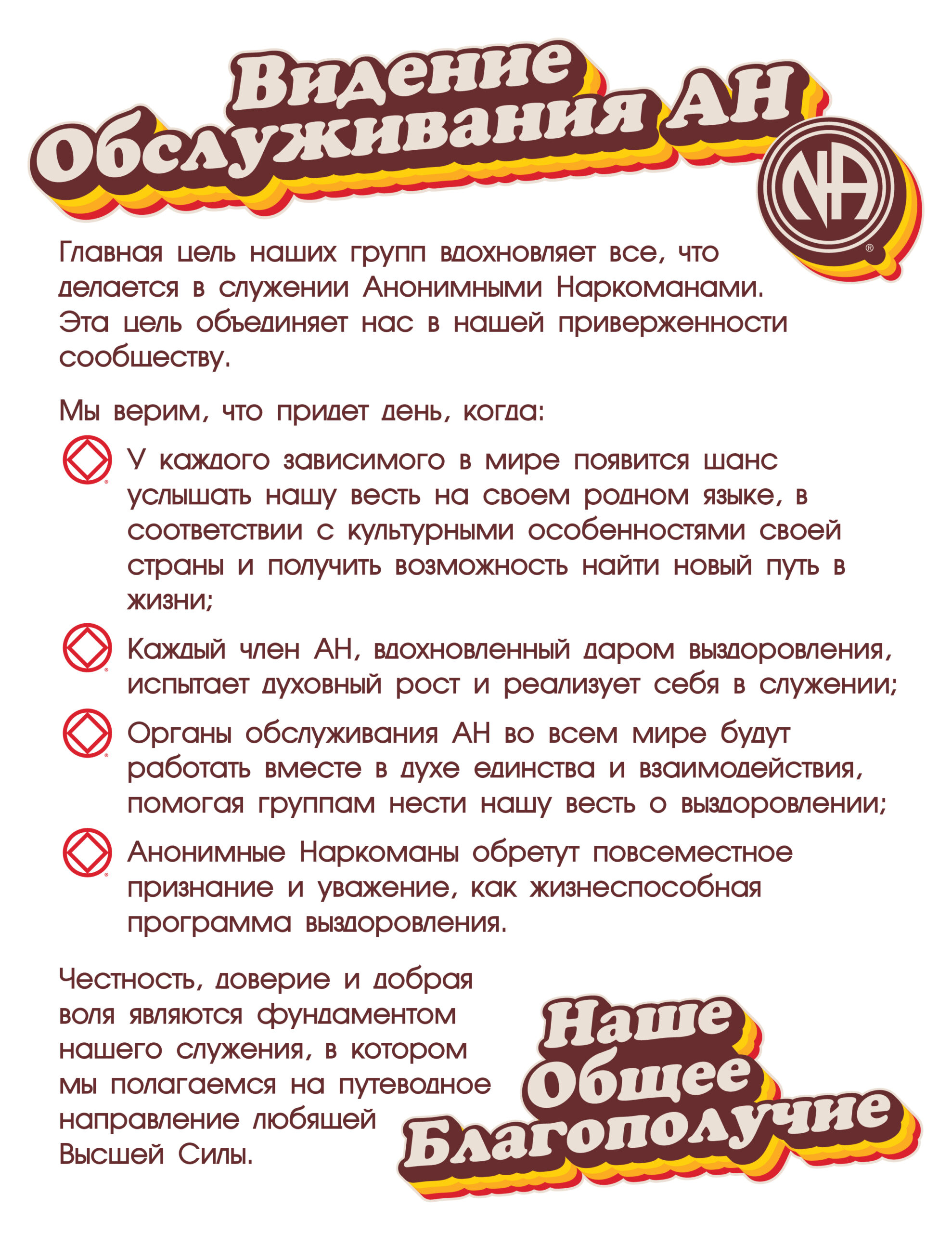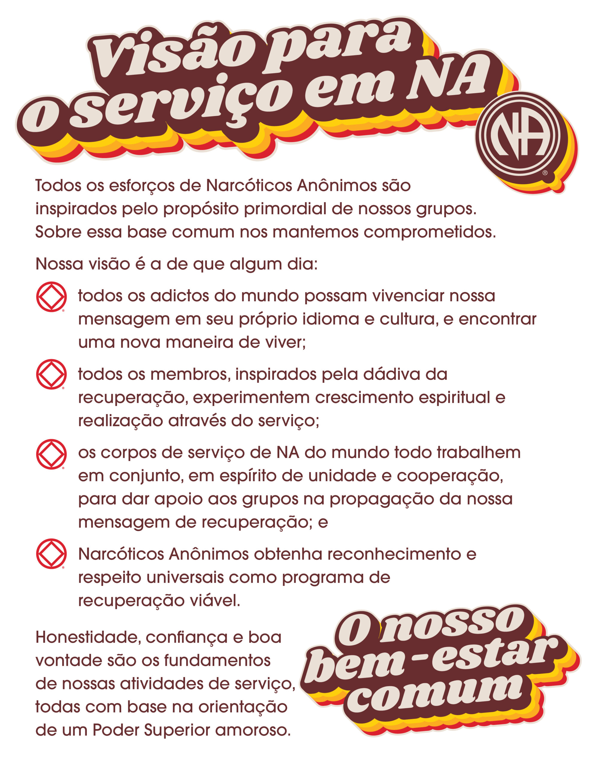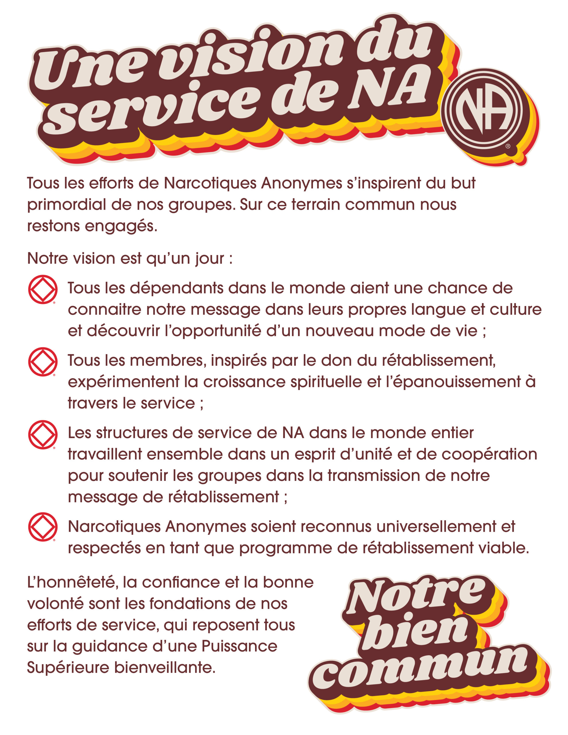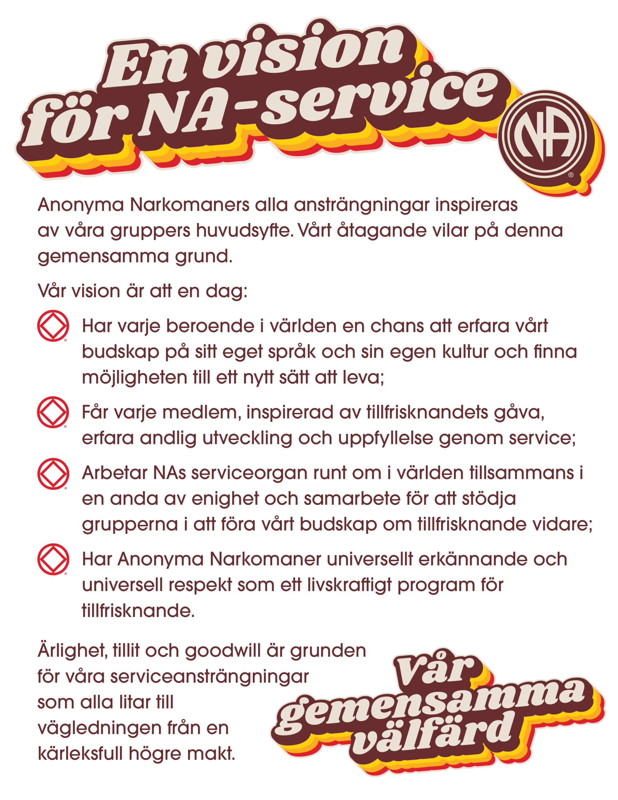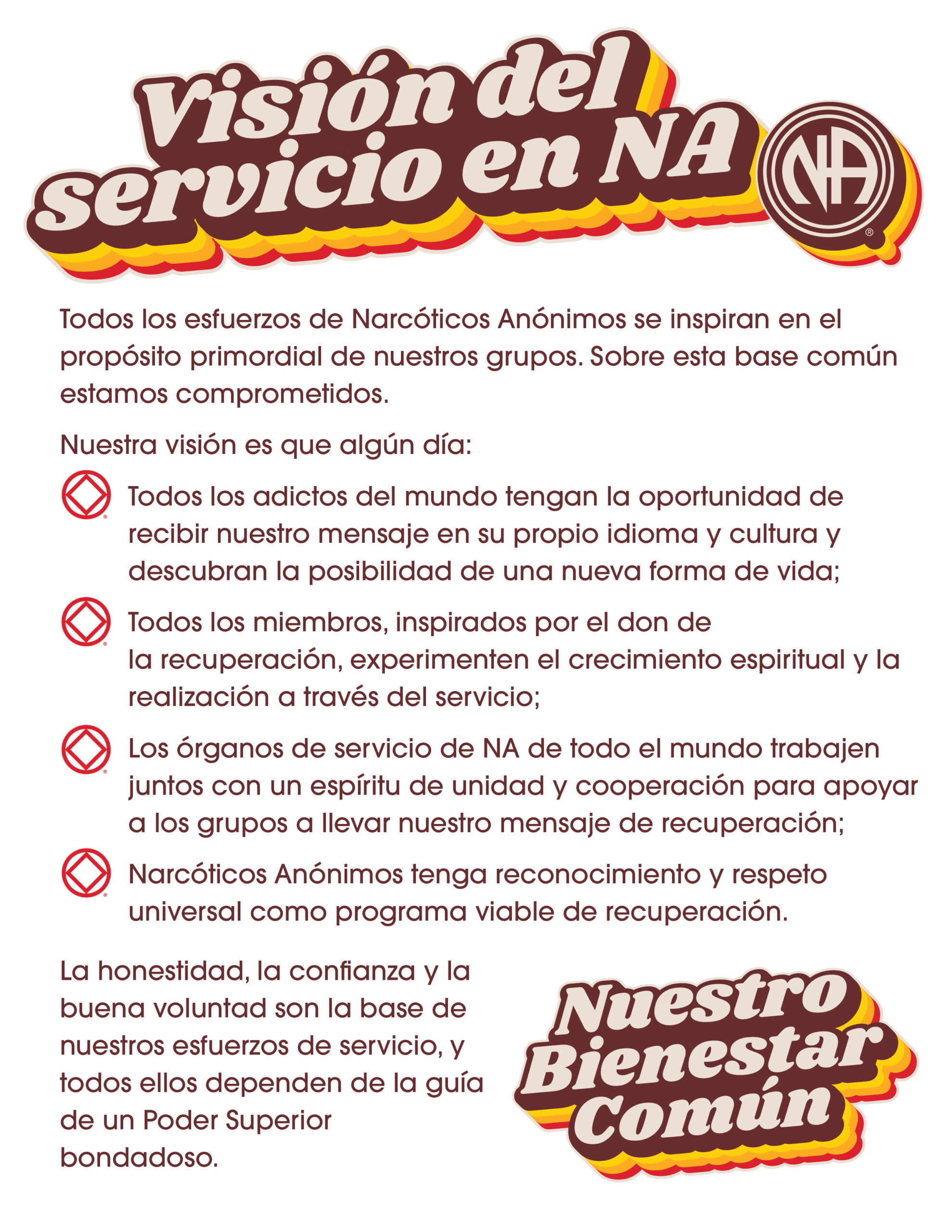 Narcotics Anonymous World Services (“NAWS”) provides literature, service materials, bulletins and various other tools for NA members, NA groups, and NA service committees as resources in their NA service delivery efforts. Our production and distribution of these materials is not intended to imply that NAWS is in a position of authority over any of those who use these materials. NAWS does not have any centralized control over any NA members, NA groups, or other NA service committees.