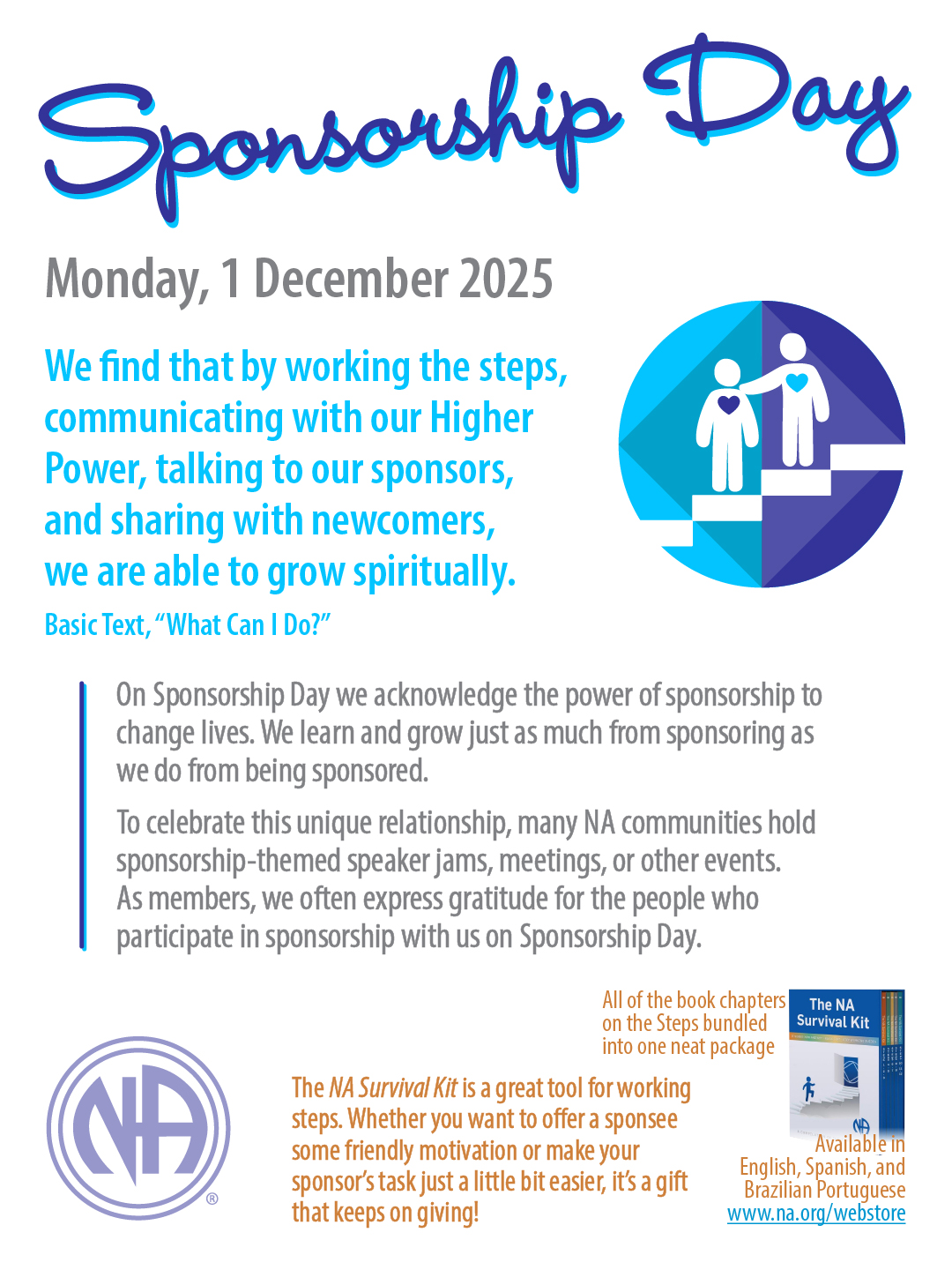 Addicts can celebrate Sponsorship Day in many ways. Many choose to gather with their sponsorship families or read from the Sponsorship book at their meetings. Areas may choose to hold local events such as a sponsor-sponsee speaker jam or brunch.